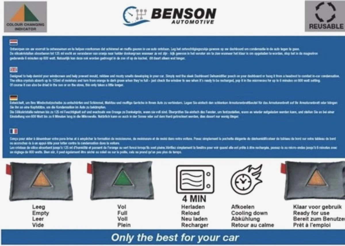 Ontworpen om uw voorruit te ontwasemen en te helpen voorkomen dat schimmel en muffe geuren in uw auto ontstaan. Leg het ontvochtigingszakje gewoon op uw dashboard om condensatie in de auto tegen te gaan. De silicakristallen absorberen tot 125 ml vocht en veranderen van oranje naar helder donkergroen wanneer ze vol zijn. Kijk gewoon in het venster om te zien wanneer het klaar is om opgeladen te worden, stop het in de magnetron gedurende 6 minuten op 600 watt. Natuurlijk kan deze ook worden gedroogd in de zon of op de kachel, dit duurt alleen wat langer.