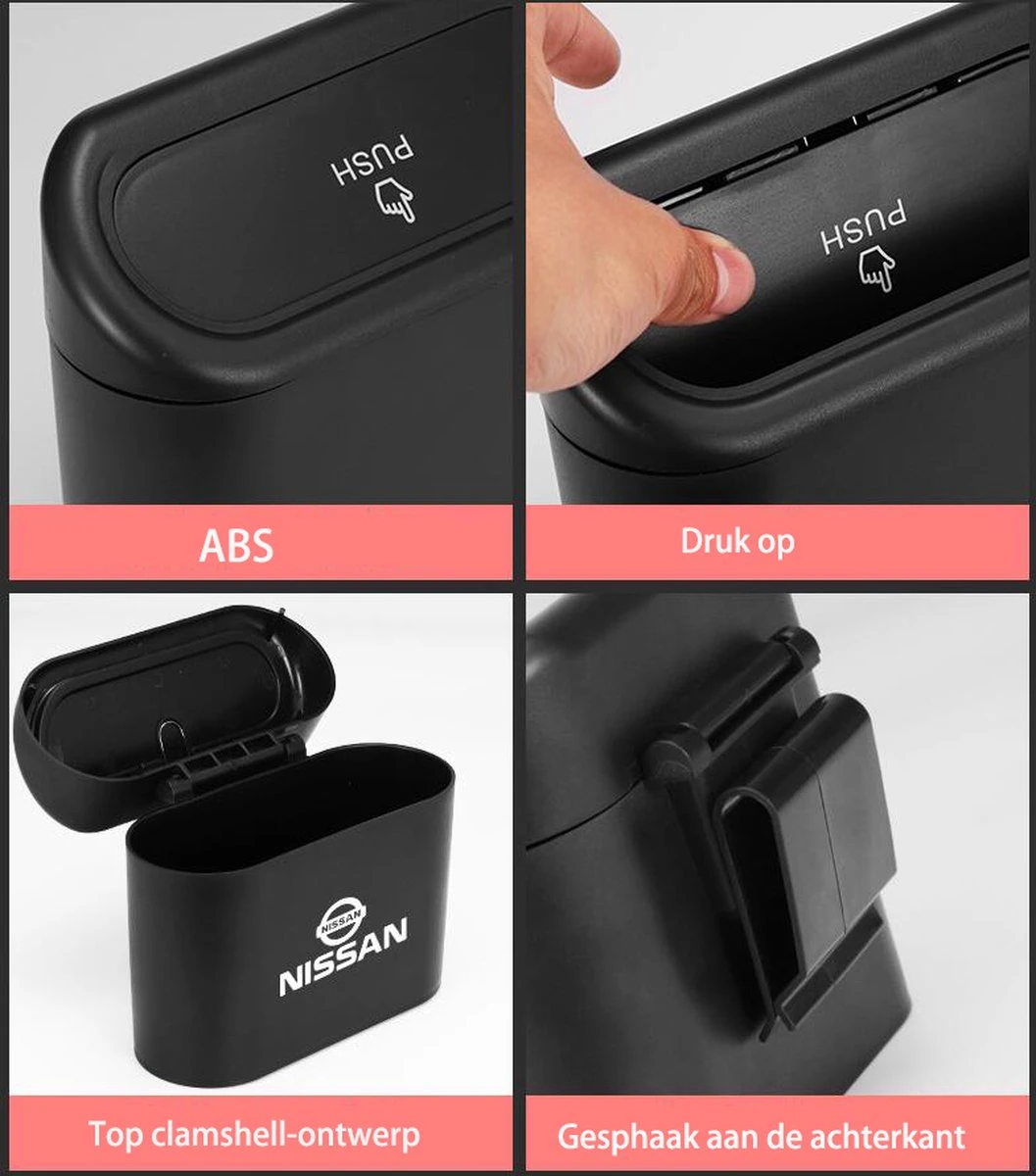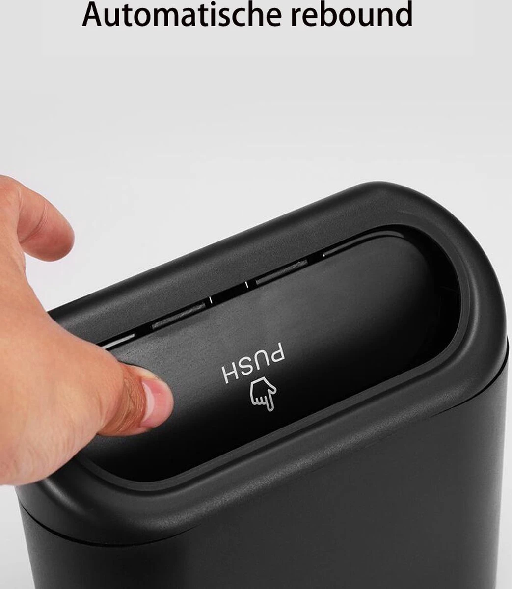 Deze prullenbak zorgt ervoor dat de auto altijd opgeruimd en schoon is. Hij is gemakkelijk te plaatsen op verschillende plekken in de auto. Met behulp van dit product kunt u uw afval geurloos kwijt. Daarnaast lekt de prullenbak niet en is die gemakkelijk schoon te maken. Naast het autogebruik kan de prullenbak ook voldoen aan uw nette behoefte op kantoor en voor in huis. Het product maakt gebruik van het gloednieuwe materiaal ABS. De prullenbak heeft een deksel die u kunt indrukken en openen.