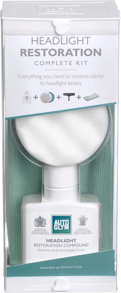 De Autoglym Headlight Restoration Complete Kit is een kit die alles bevat om doffe koplamp kappen weer te herstellen. Kunststof koplampkappen worden door weersinvloeden aangetast hierdoor verkleurt de koplamp gelig en wordt hij dof. Gevolg hiervan is dat de lichtopbrengst ernstig vermindert en de auto zelfs kan worden afgekeurd bij de APK. Met de Headlight Restoration Kit voorkom je dit!