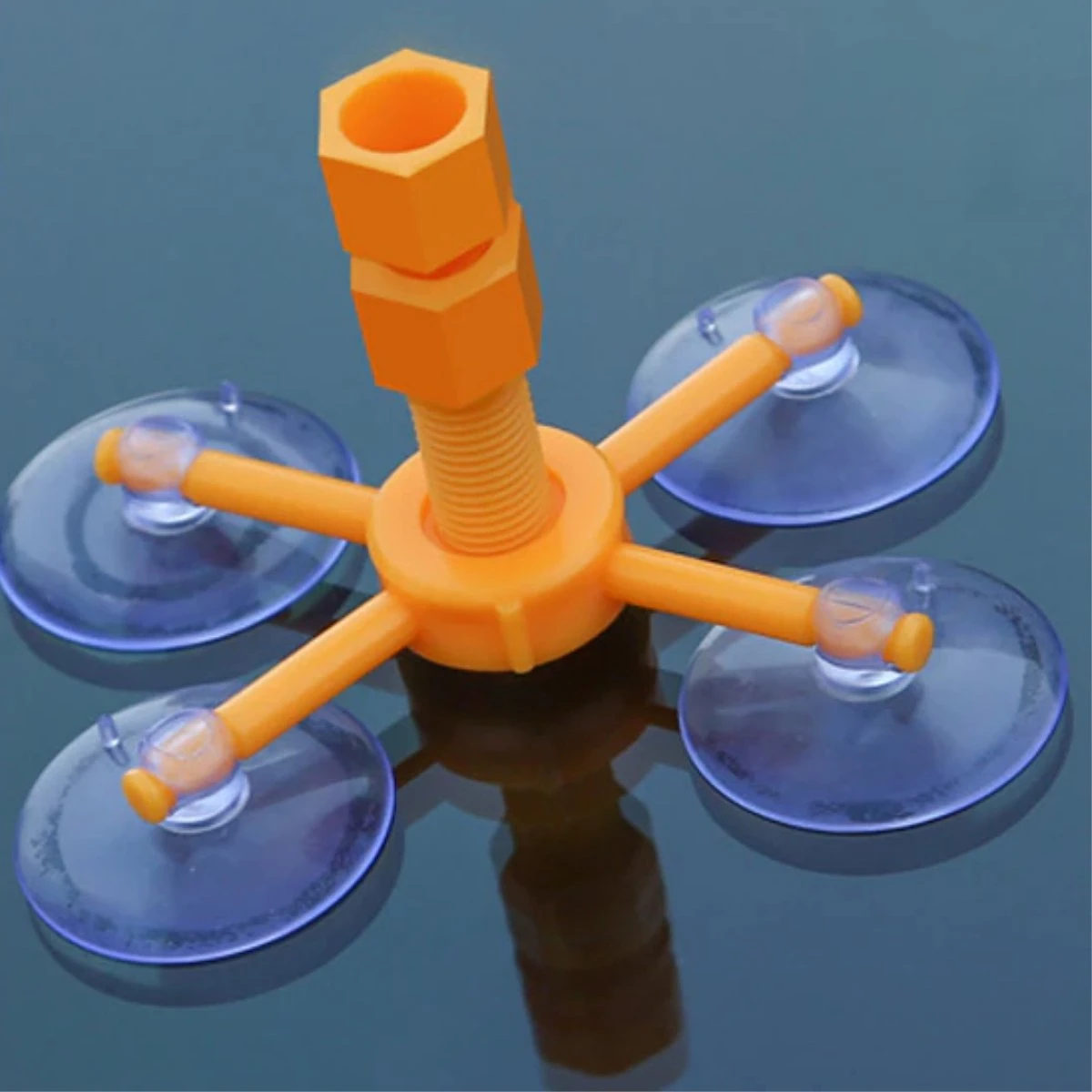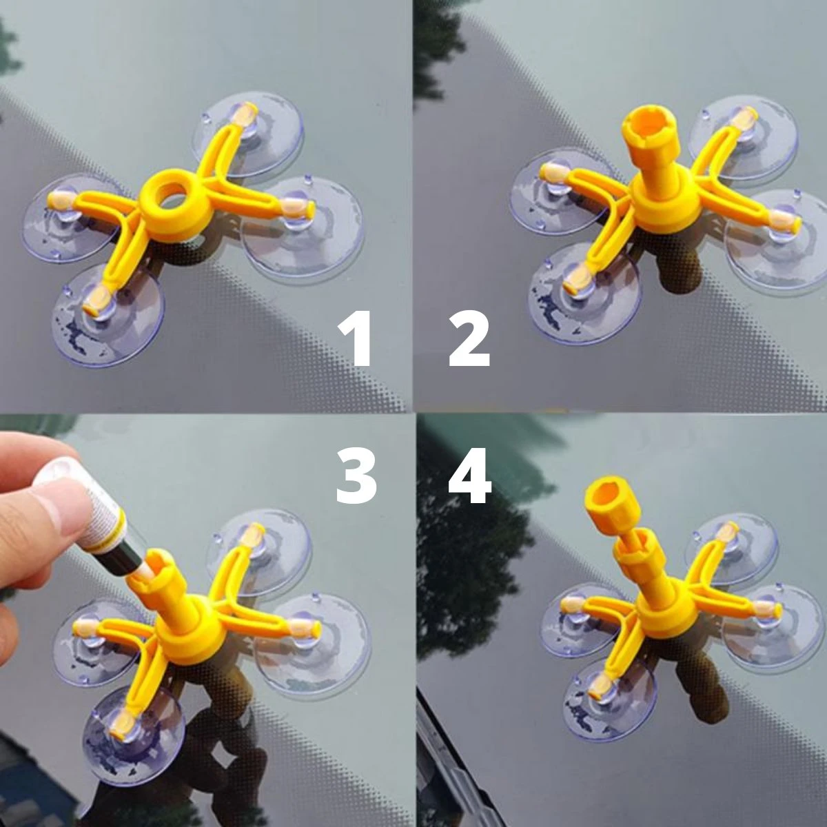 Stap 2: Plaats de injector goed met de zuignappen op het glas, en positioneer de injectie poort precies boven het sterretje. Het is belangrijk dat de zuignappen een goede grip op de ruit hebben. Draai dan de cilinder in het gat totdat deze het glas aanraakt.