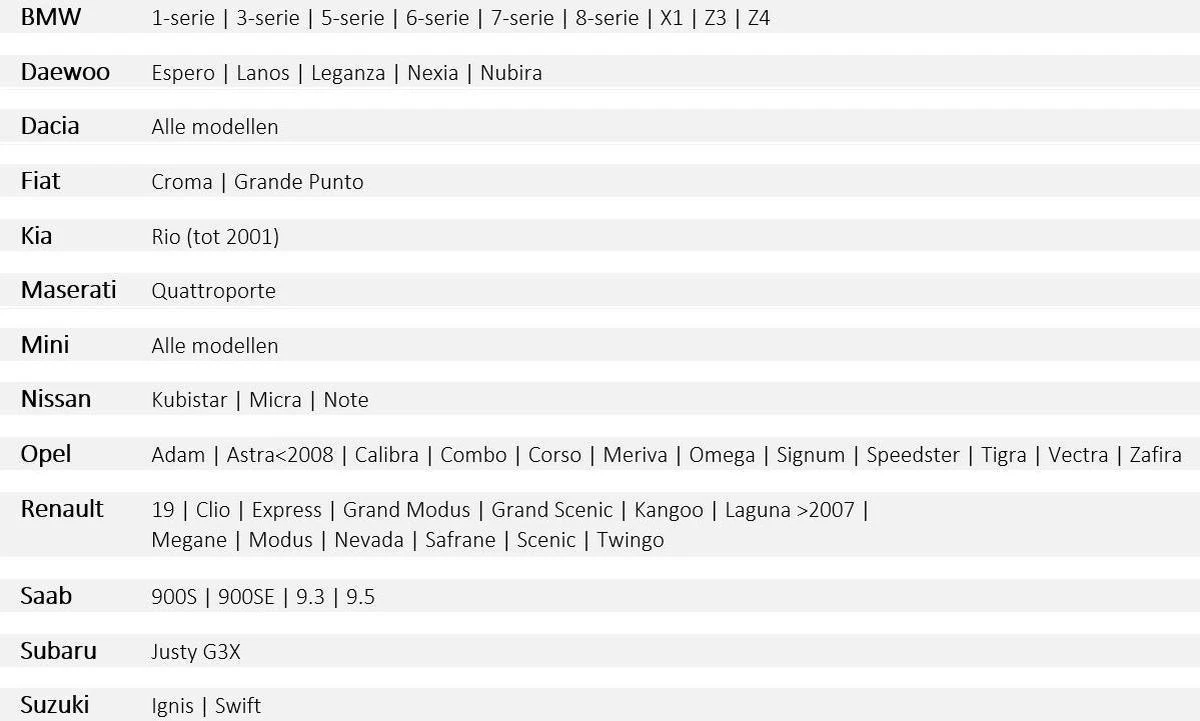 Type B. BMW: 3, 5, 7, 8, M3, M5, Z3. Ford: Escort, Orion to 7/90. Opel: Corsa, Tigra, Astra, Calibra, Vectra, Zafira, Omega, Senator. Renault: Clio, Kangoo, R5, R9, R19, R31, Twingo, Megane, Laguna, Laguna II, Safrane, Scenic. Seat: Ibiza (2002), Cordoba