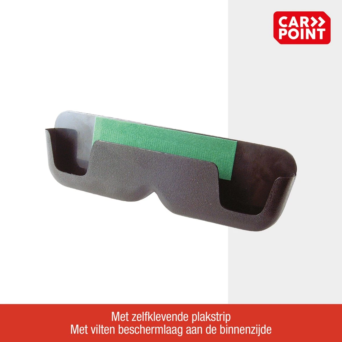 Met de Carpoint zelfklevende brilhouder heeft u altijd de bril of zonnebril binnen handbereik. De zelfklevende brilhouder is eenvoudig te plakken op vlakke ondergronden in auto, camper of caravan. De vilten beschermlaag aan de binnenzijde van de houder zorgt voor bescherming van de bril tegen krassen. De houder heeft een afmeting van 17x5x2.5cm.
