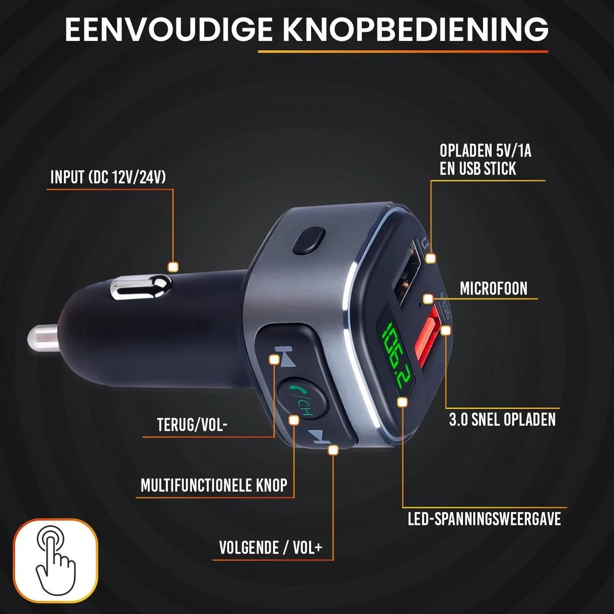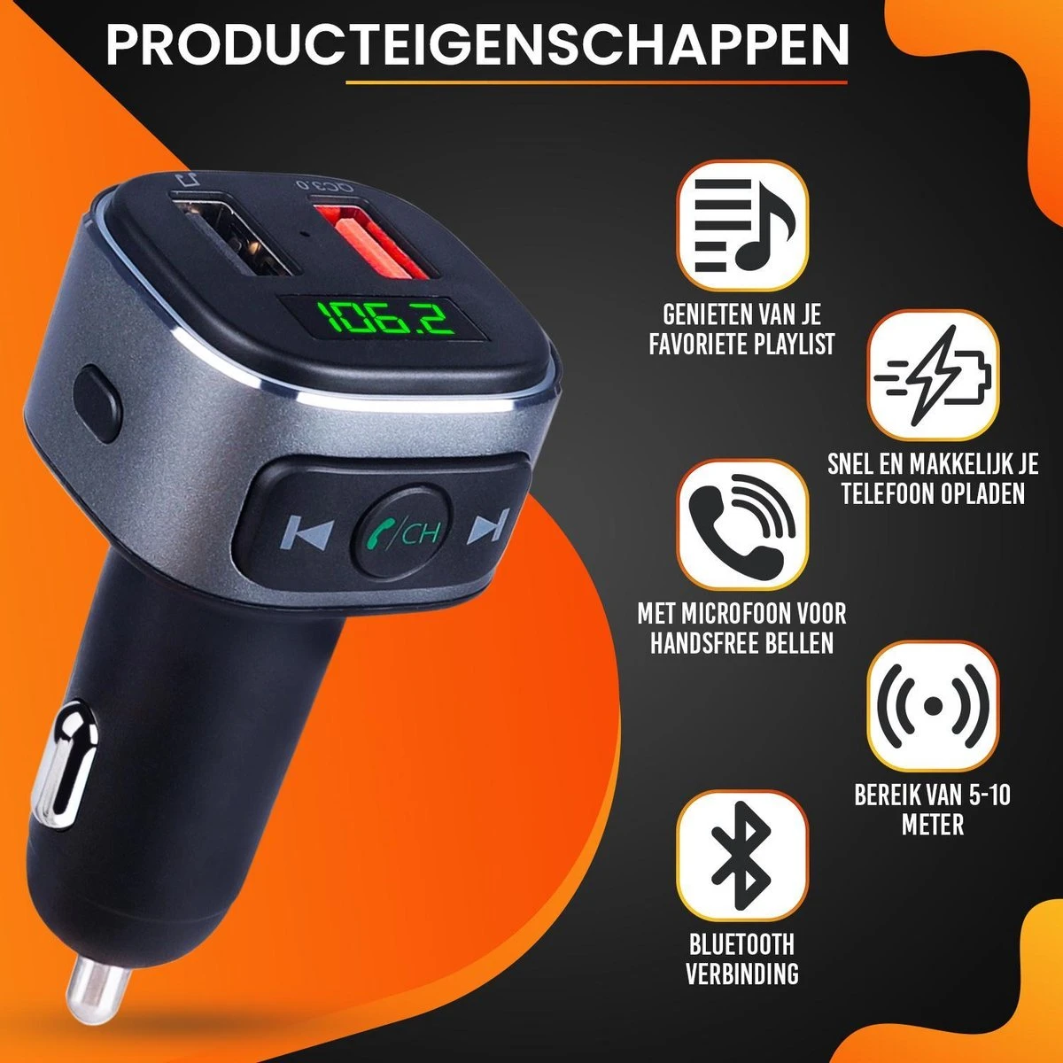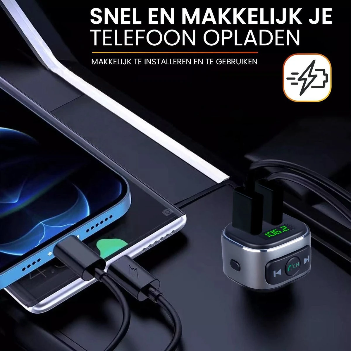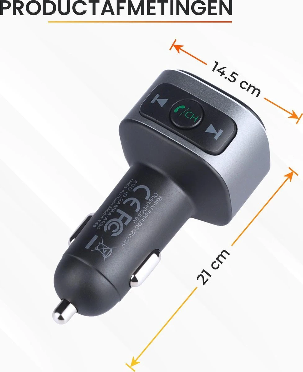 Plaats de FM transmitter in het sigarettenaansteker van het voertuig. Koppel je smartphone (eenmalig) via Bluetooth. Stel de frequentie van de autoradio in op de vrije frequentie (of naar eigen wens) die wordt aangegeven op de transmitter. Voorbeelden: 87,5, 87,6, 107,9 of 108FM. De transmitter is nu succesvol verbonden en klaar voor gebruik. Zet het volume van de smartphone op de hoogste stand om ruis te voorkomen. Regel het geluid in de auto via de bediening van de radio.