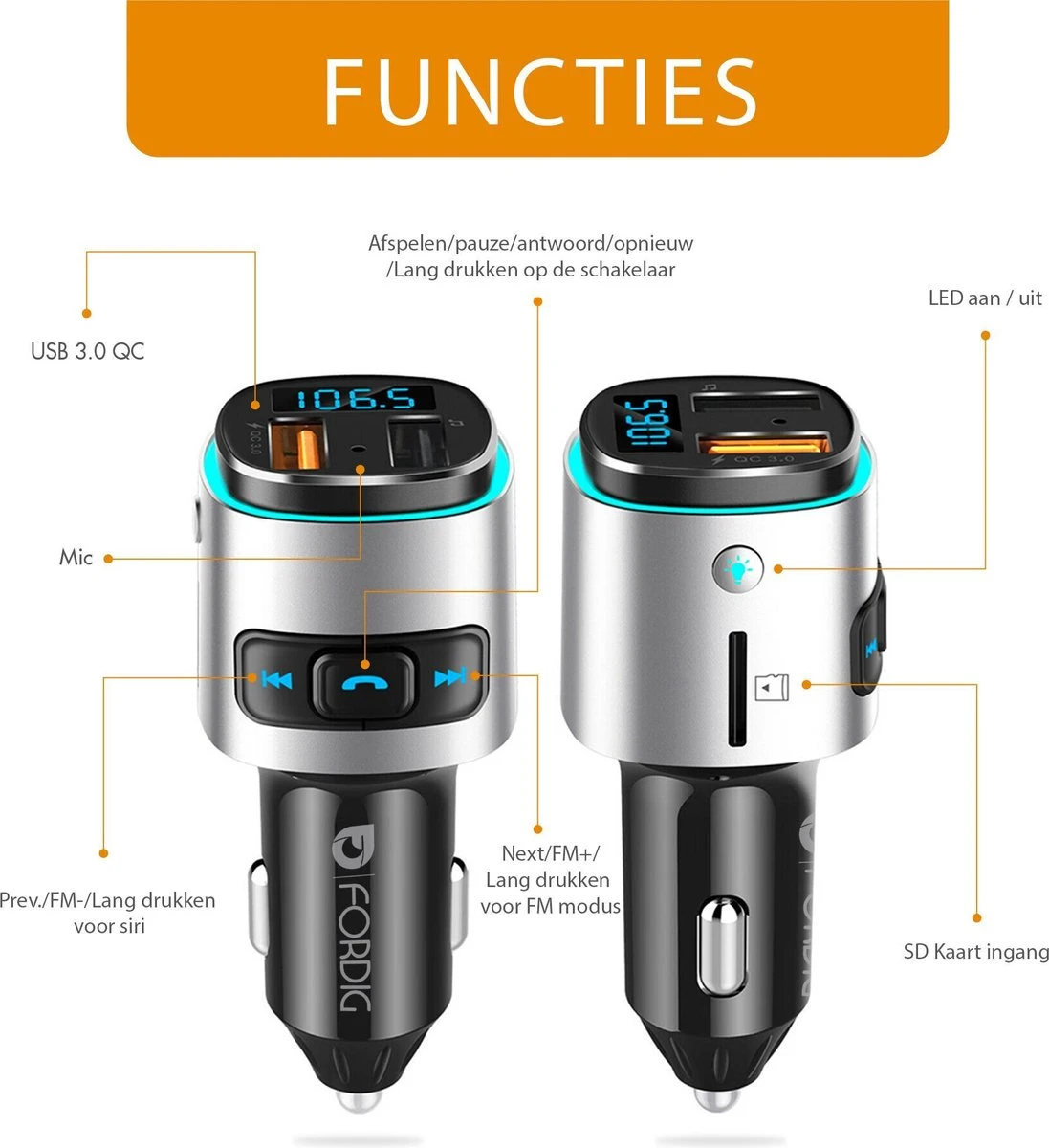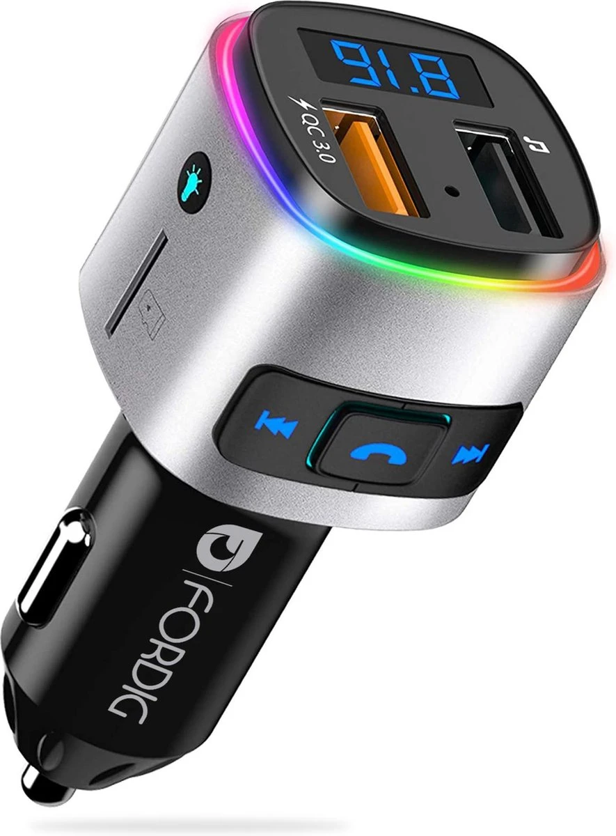 90% van de automobilisten geven toe mee te zingen in de auto, die andere 10% heeft de ForDig Draadloze FM-Transmitter nog niet! Luister voortaan je favoriete nummers zonder radioreclame via de Bluetooth 4.2, Micro-SD of USB-functies. Vind het juiste knopje in het donker door de LED-verlichting met 7 prachtige kleuren, ontloop hoge boetes door handsfree te bellen via de ingebouwde microfoon met ruisreductie en vertel Siri of Google Assistent dat je even wilt laten weten dat je McDonalds meeneemt naar huis via een berichtje/belletje. Je komt ook nergens aan met een lege telefoon, doordat je met de USB 3.0 Quick Charge de mogelijkheid hebt om tot 4 keer sneller op te laden! AY Commerce BV staat voor veiligheid maar ook voor jouw plezier!