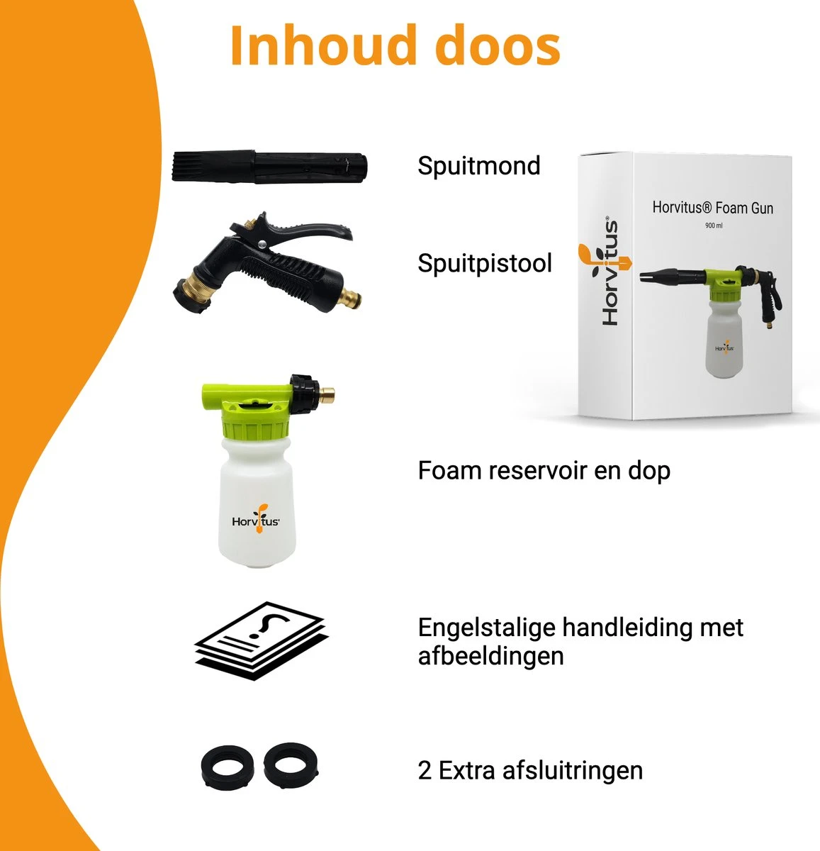 - Inhoud doos: 1x Horvitus® Foam gun, 1x Engelstalige handleiding met afbeeldingen, 2x Extra afsluitringen