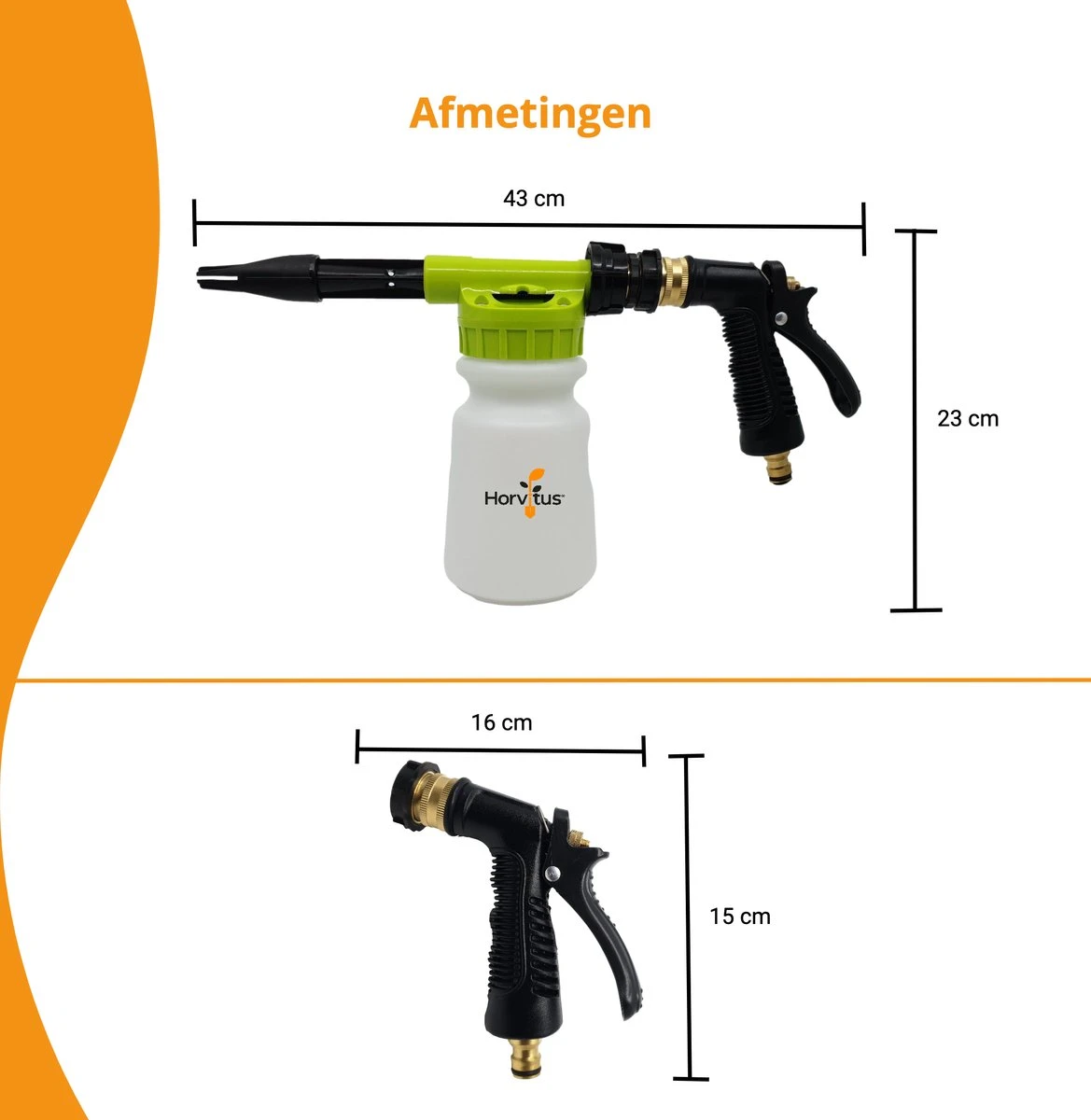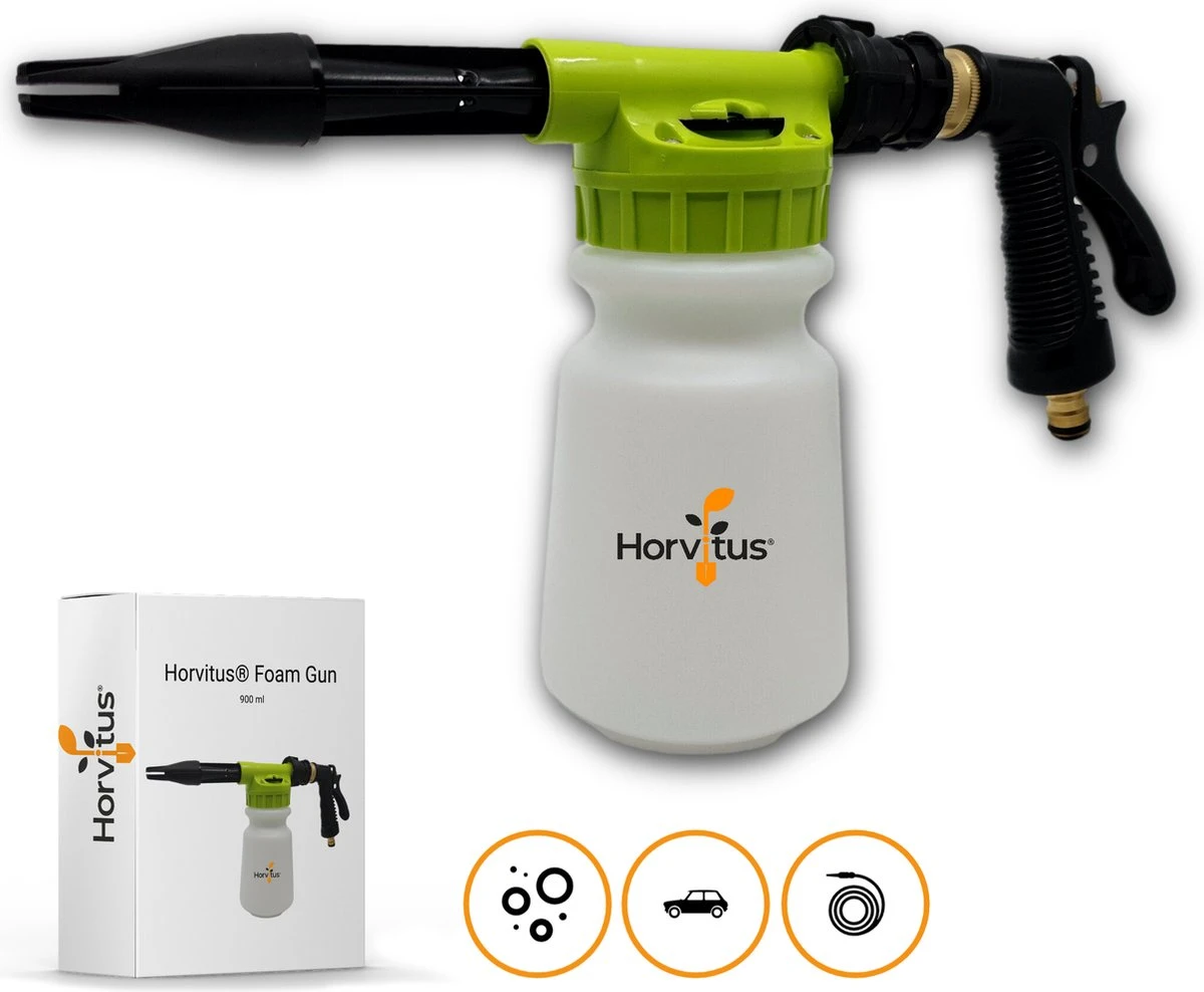 Je auto snel en eenvoudig wassen? Dat kan met de Horvitus® Foam gun. Aan te sluiten op iedere tuinslang met snelkoppeling. Vul het reservoir met Snow foam van je keuze, stel de hoeveelheid schuim in en begin! Even in laten werken, poetsen, klik het pistool los en spuit af.