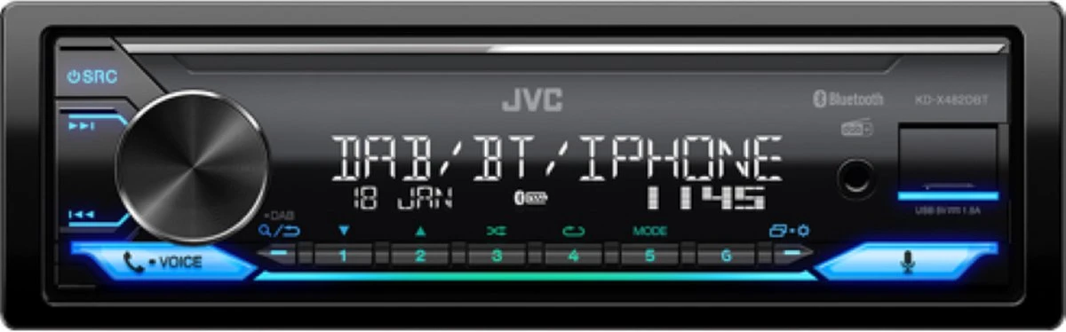 De JVC KD-X482DBT autoradio zonder CD loopwerk met geïntegreerde DAB+ digitale radio ontvanger en draadloze bluetooth technologie. De geïntegreerde Bluetooth module ondersteund automatisch koppelen met een iphone, streaming DJ, JVC Remote Control App, Amazon Alexa en Spotify. Een 2-lijns VA LCD display, toetsen met instelbare verlichtingskleur, USB poort en AUX ingang vormen het afneembaar voorpaneel.