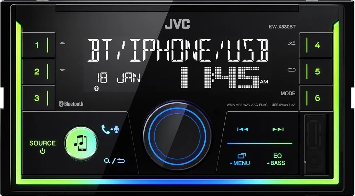 De KW-X830BT is geschikt voor bediening vanaf het stuur. De toetsverlichting is variabel instelbaar. De twee 2,5V pre-out aansluitingen geven extra outputmogelijkheden.