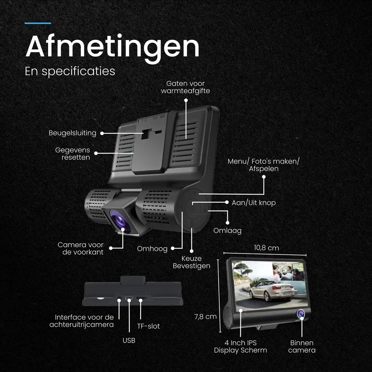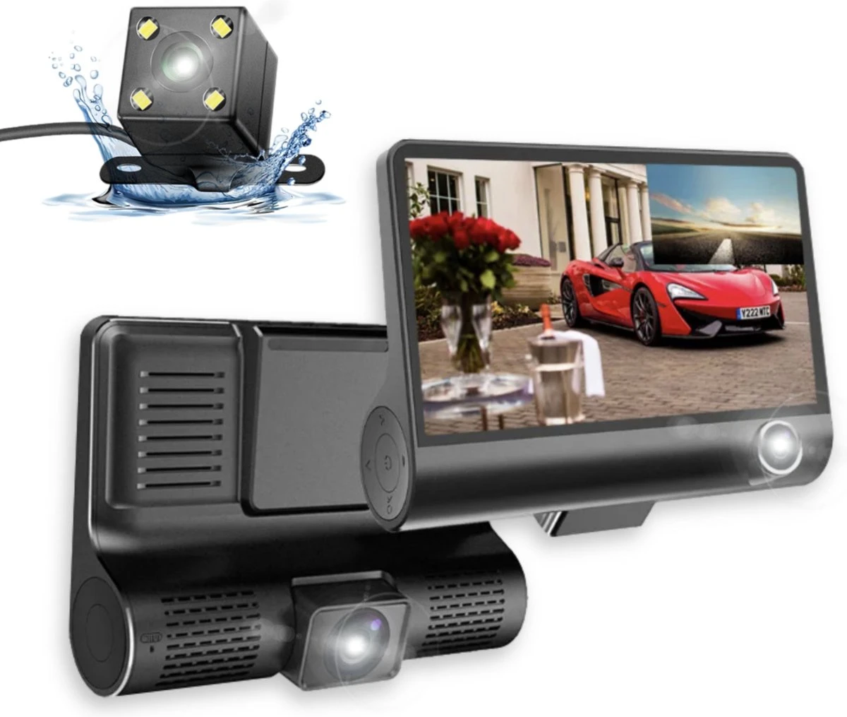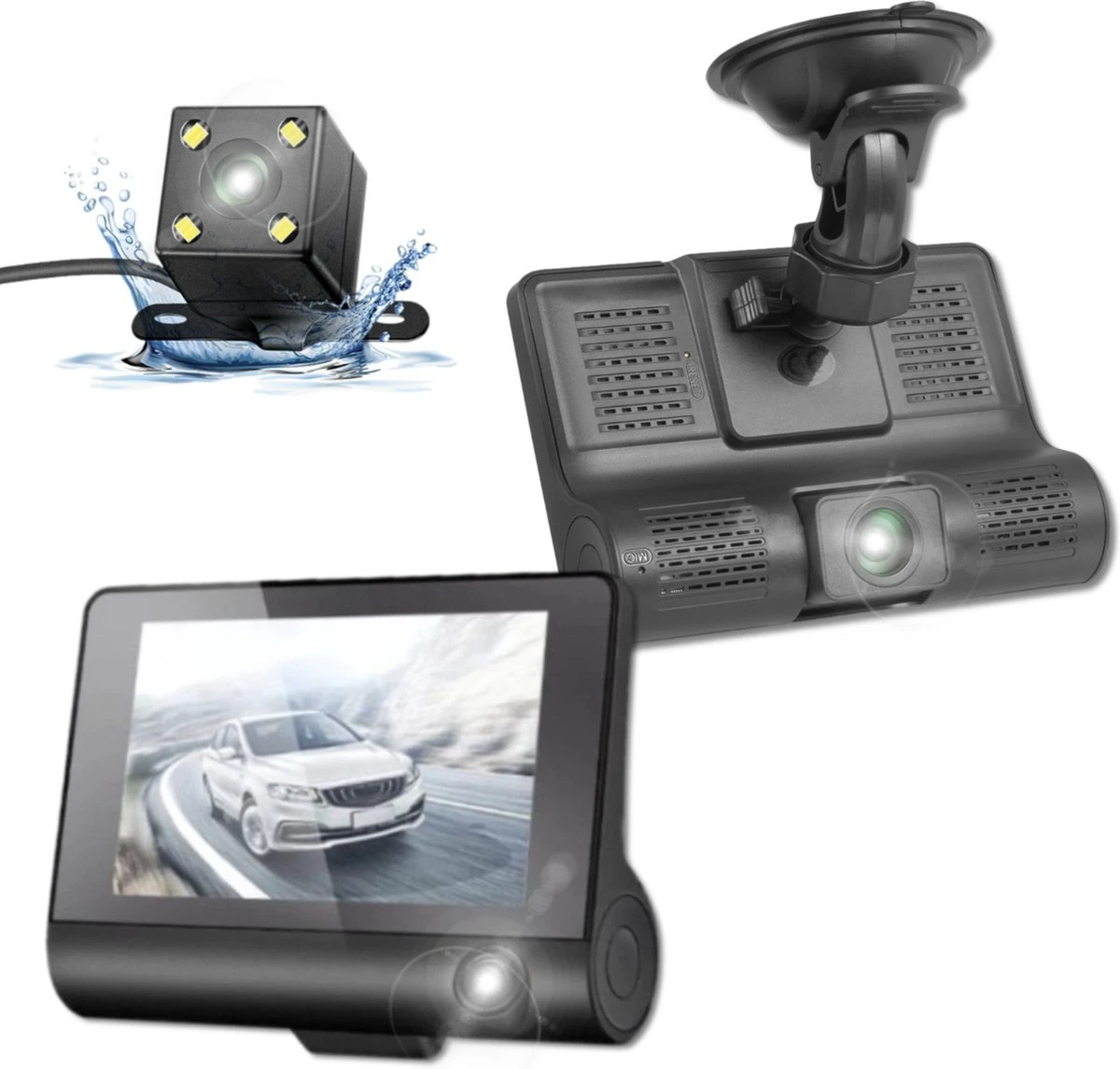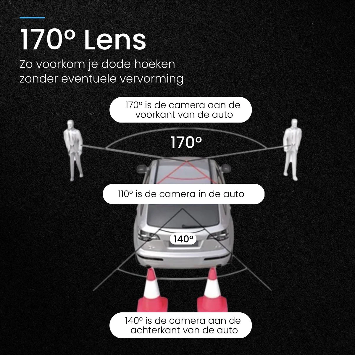 Camera kijkhoeken = 170° (voorkant), 110° (binnen in de auto) en 140° (achterkant)