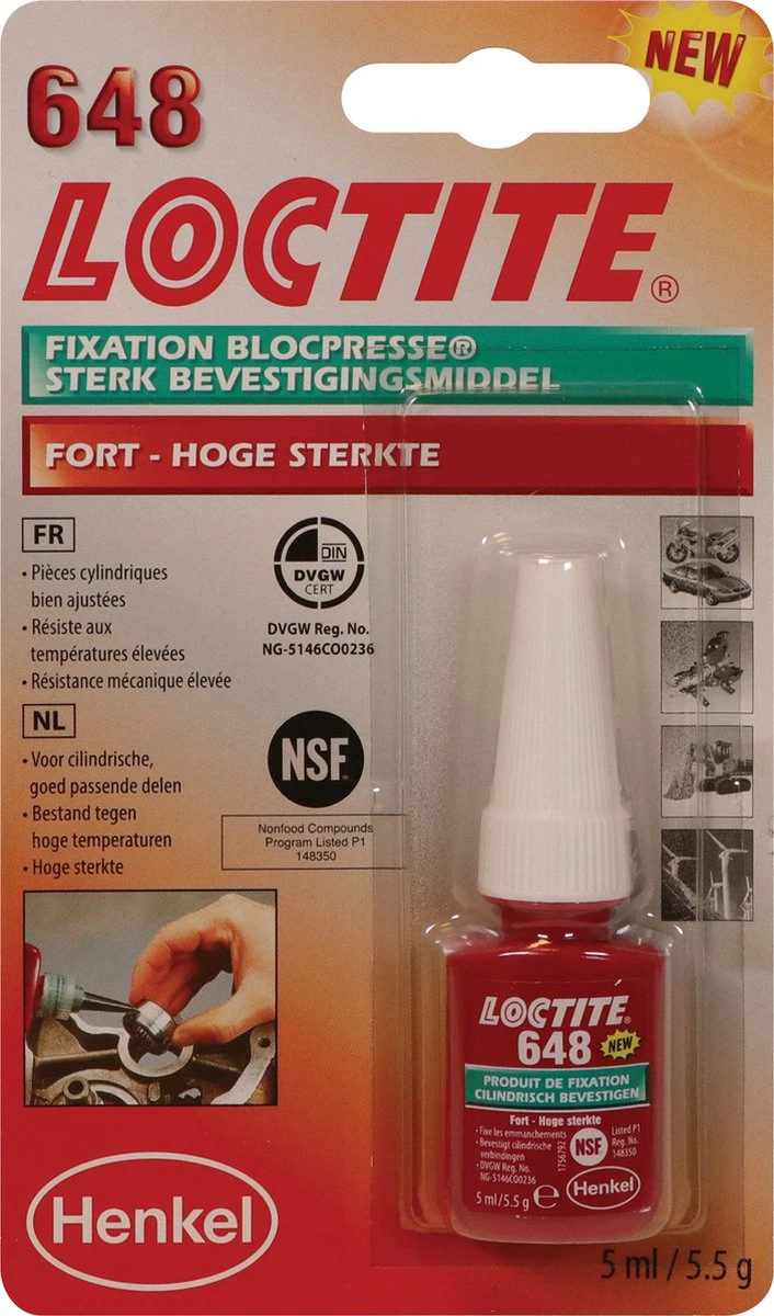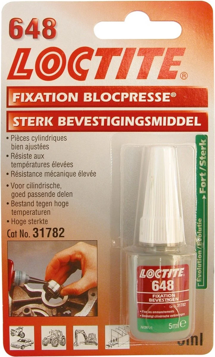 Lijm voor cilindrische bevestiging – hoge sterkte. Hoge temperatuurbestendigheid. Aanbevolen voor het bevestigen van onderdelen met een losse of interferentiepassing. LOCTITE 648 is ontwikkeld voor het verlijmen van cilindrische passende onderdelen. Het product hardt uit bij afwezigheid van lucht en ingesloten tussen nauwsluitende metalen oppervlakken en voorkomt het loskomen en lekken door schokken en trillingen. Het zorgt voor een stevige uitharding. Het product is ook geschikt voor passieve materialen, levert goede prestaties bij hoge temperaturen en heeft een goede olietolerantie.