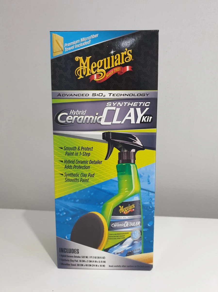 De Meguiar’s Hybrid Ceramic Synthetic Clay Kit bevat alles wat jij nodig hebt om een gladde glazen afwerking te herstellen en een laagje bescherming achter te laten. het meegeleverde synthetische kleikussen is ontworpen om te presteren als authentieke klei, maar hanteert makkelijker en kan worden herbruikt. De spons reinigt effectief vastzittend vuil zonder verf te verwijderen. De beschermingslaag welke de Ceramic Detailer achterlaat zorgt ook voor effectieve waterresistentie.