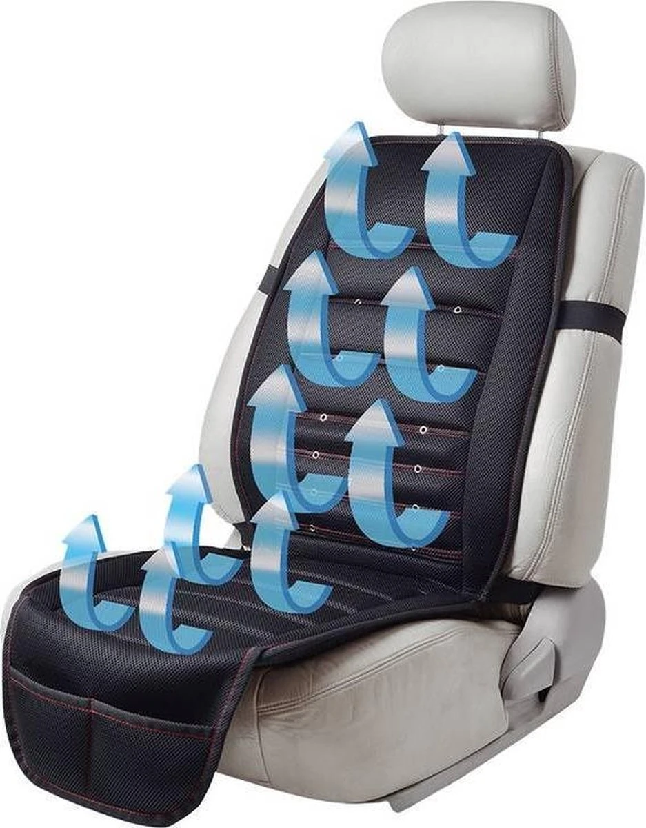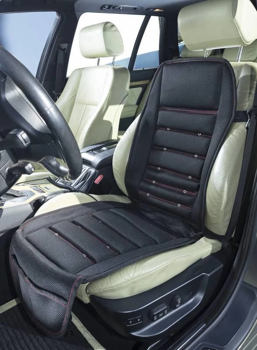 Met een ingebouwde ventilatie om je rug heerlijk koel te houden! Naast een stabiele en veilige zitpositie biedt deze autostoelhoes ook ventilatie, zodat zweten zal worden voorkomen. Natuurlijk erg fijn tijdens warmere dagen! Kenmerken: * Geventileerde autobekleding voor lange ritten bij zomerse temperaturen. * Ventilatie in het zit- en ruggedeelte * 22 luchtuitlaten zorgen voor een aangename koeling * Stabiele luchtkanalen zorgen voor een gelijkmatige luchtstroom * Ventilator traploos instelbaar * Ook zeer geschikt voor thuis of op het kantoor Technische specificaties: * Ingangsspanning: 12 volt * Ingangsstroom: max. 1 amp. * Stroomverbruik: 12 watt * 12 volt autostekker met LED-indicatielampje * Aan / uit schakelaar * Zit-airbag geschikt * Afmetingen: 112 x 44 cm, aansluitkabel lengte 180 cm * Gewicht: 1,4 kg