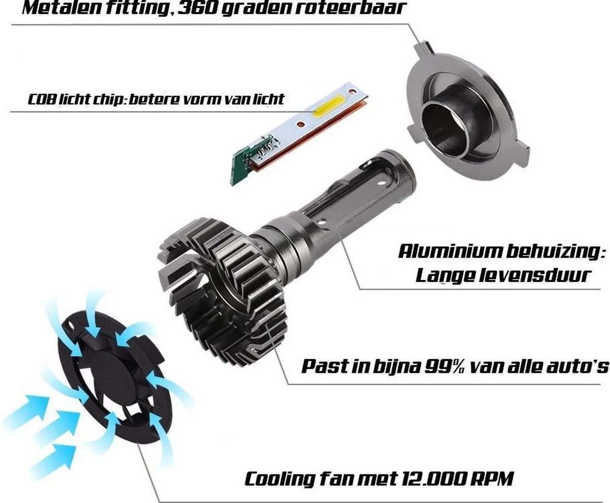 Deze LED-lamp vervangt de originele halogeenlamp in uw motor, scooter of auto. Hij is universeel te gebruiken op elke H7 aansluiting door middel van de geïntegreerde kabel. Bevat dimlicht en groot licht. Door een vermogen van 60W (30W per stuk) en 6500K levert deze lamp veel en helder licht. Deze waardes leveren ongeveer 10000 lumen. Worden geleverd per 2 stuks.