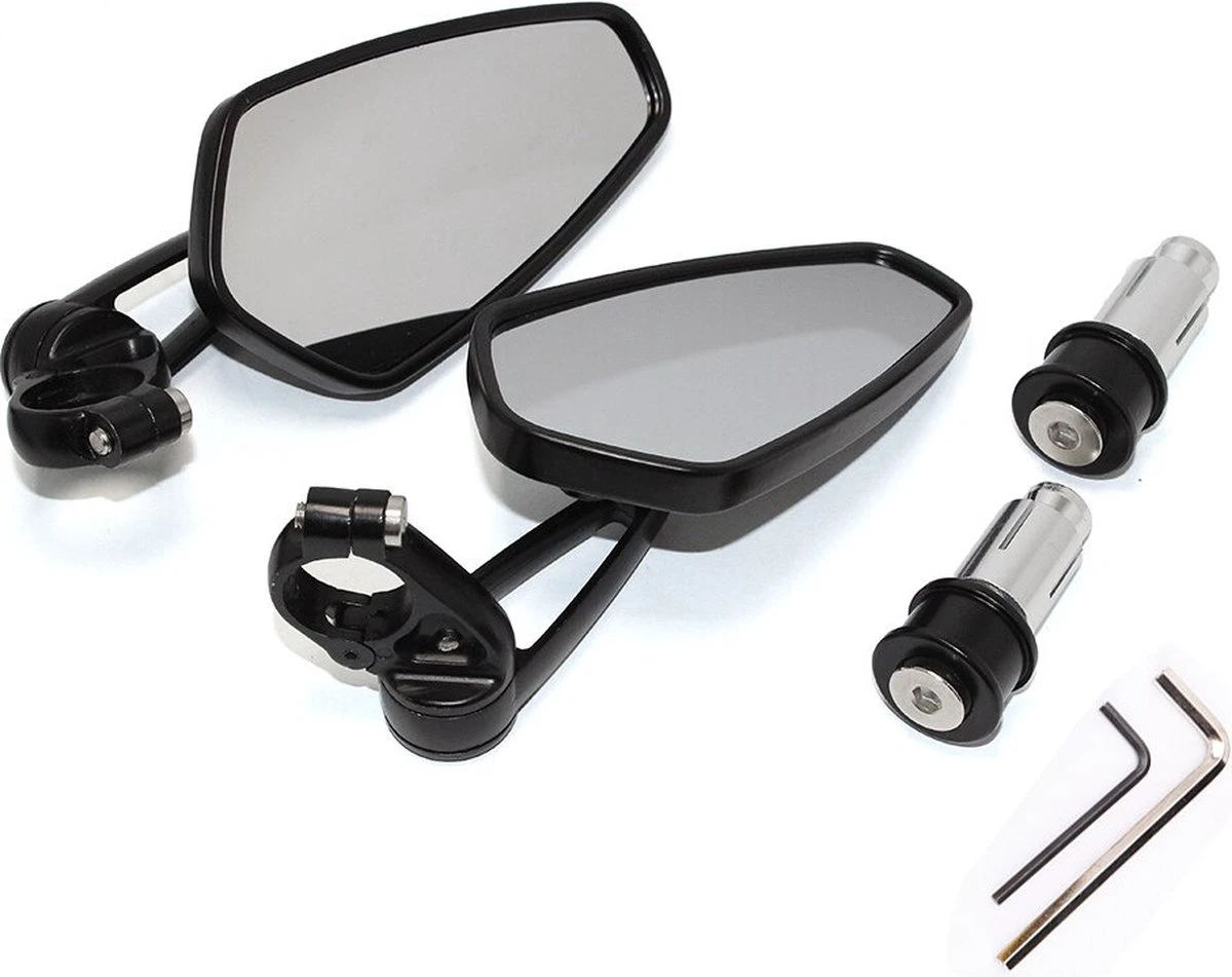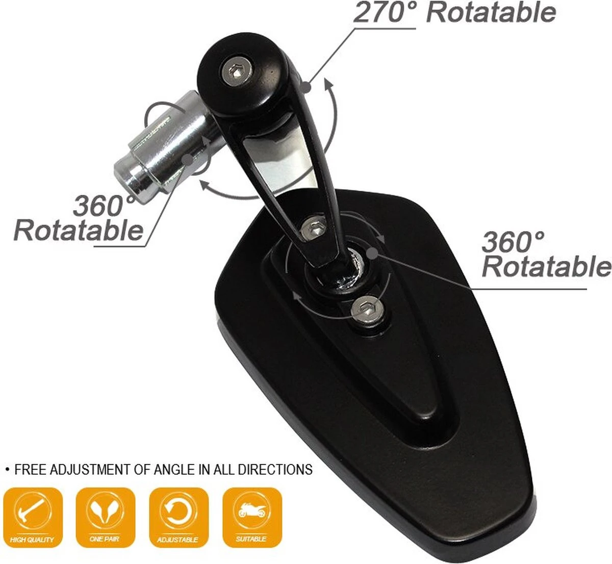Heeft u een motor of scooter en gaat u graag touren of op reis met uw motor? Zoek dan niet verder! Deze spiegel set wordt bevestigt aan uw bar ends van de motor of scooter. Zo heeft u altijd zicht wat er achter u gebeurt. Bovendien zijn deze spiegels gemaakt van hoogwaardig materiaal, hebben ze een breed design waardoor u een goed bereik heeft en ze zijn universeel.