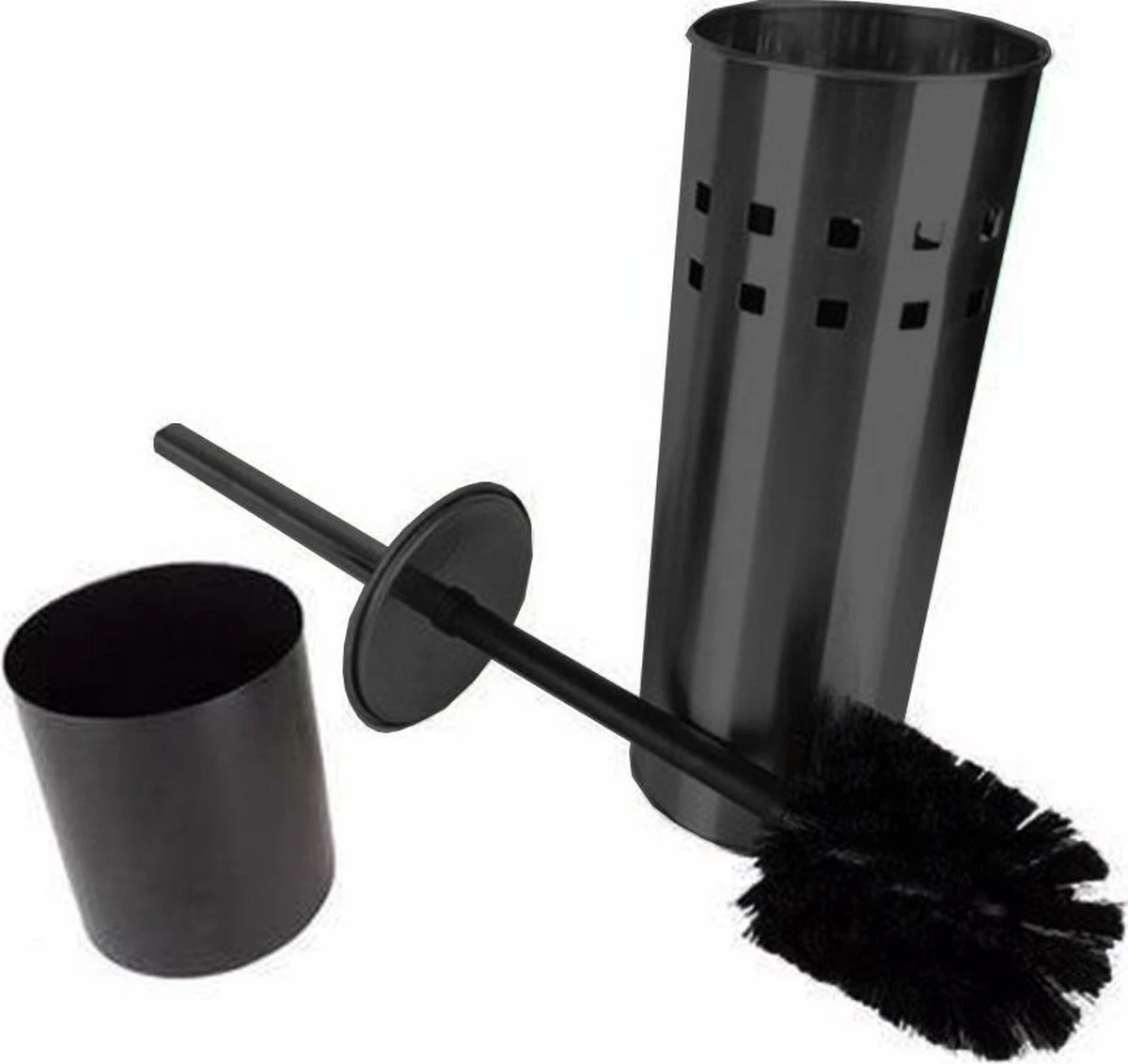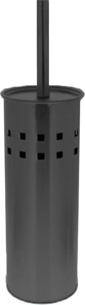 De vrijstaande toiletborstel met houder is uitgevoerd in mat zwart rvs. De toiletborstel met houder is voorzien van een kunststof bakje.