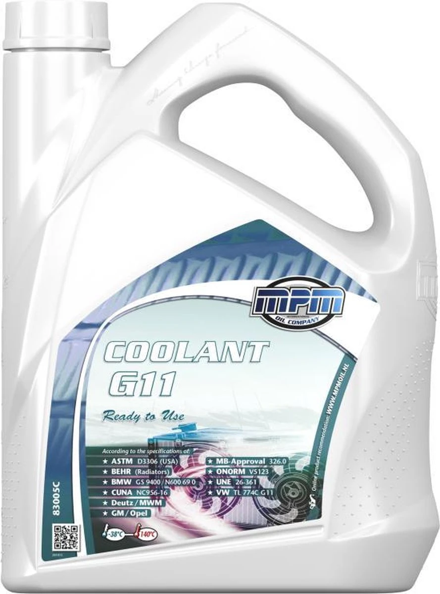 MPM koelvloeistof -38C G11 silicaathoudend met de VW TL 774C G11 specificatie’s is een hoge kwaliteit koelvloeistof die gedurende het gehele jaar te gebruiken is in de koelsystemen van benzinemotoren en dieselmotoren. Dankzij het speciale additieven pakket en de hoge kwaliteit mono ethyleenglycol behoort deze koelvloeistof -38C VW TL 774C /G-11 tot de hoogste kwaliteit in de markt. Deze koelvloeistof dient onverdund te worden gebruikt en heeft een vorstbeveiliging tot -38C