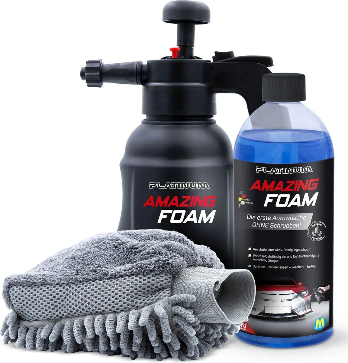 - Leveringsomvang: 1x Platinum Amazing Foam (gebruiksklare oplossing) 1000ml, 1x Platinum Amazing Foam 3-in-1 reinigingshandschoen, 1x Platinum Amazing Foam drukspuitfles met overdrukventiel.