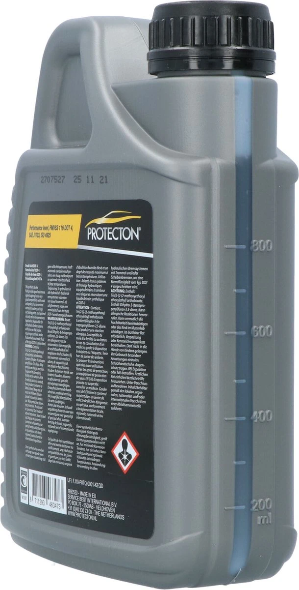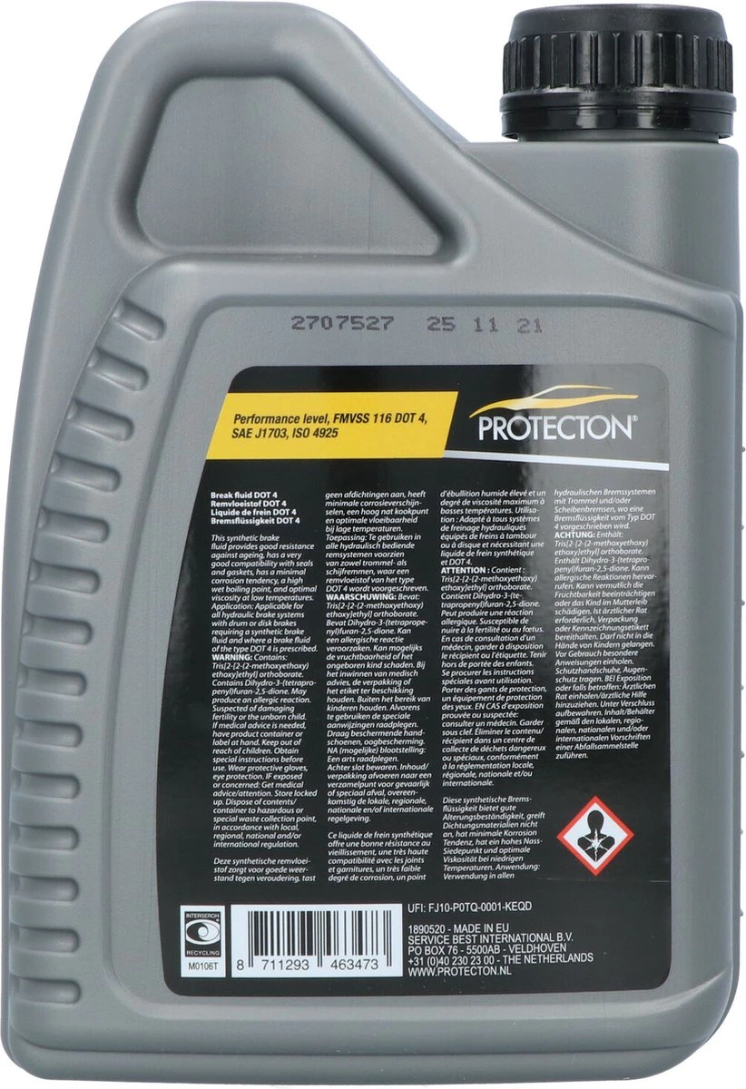 Deze Protecton DOT4 synthetische remvloeistof zorgt voor goede weerstand tegen veroudering, tast geen afdichtingen aan en heeft minimale corrosieverschijnselen, een hoog nat kookpunt en optimale vloeibaarheid bij lage temperaturen. Protecton DOT 4 remvloeistof is te gebruiken in alle hydraulisch bediende remsystemen voorzien van zowel trommel- als schijfremmen, waar een remvloeistof van het type DOT 4 wordt voorgeschreven.