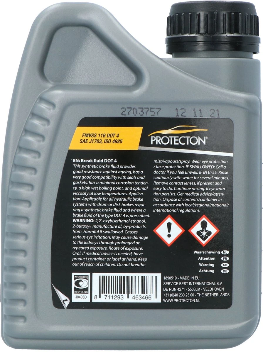 Deze synthetische remvloeistof van Protecton zorgt voor goede weerstand tegen veroudering, tast geen afdichtingen aan, heeft minimale corrosieverschijnselen, een hoog nat kookpunt en optimale vloeibaarheid bij lage temperaturen.