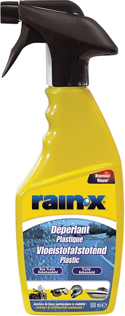 Rain-X vloeistofafstotende coating is speciaal ontwikkeld om een uitstekend beschermingslaagje tegen water aan te brengen op verschillende soorten kunststof. Het kan ook gebruikt worden voor Lexan, Plexiglas, Perspex, Lucite, acryl en polycarbonaten. Dit product transformeert water in druppeltjes en laat deze afrollen om ze te verwijderen van windschermen, brillen en vizieren van helmen, voorruiten en patrijspoorten van boten.