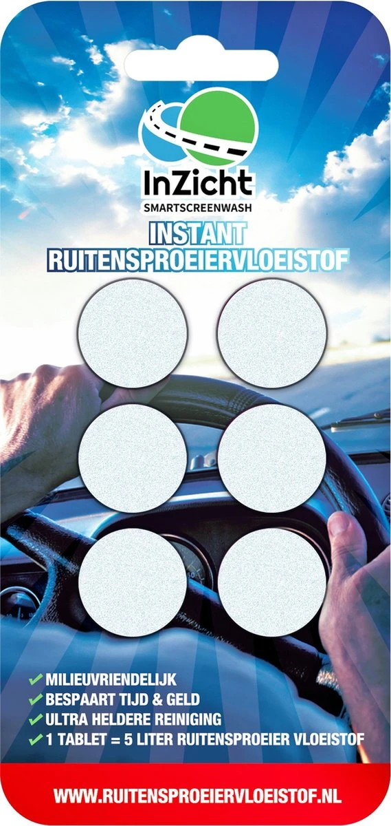 6 bruis tabletten in een blister / 1 bruis tablet maakt 5 liter Inzicht ruitensproeiervloeistof. (19 cent per liter)