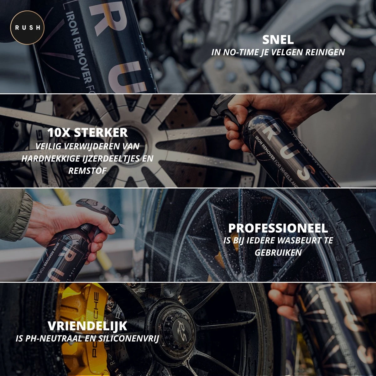 Dankzij de pH-neutrale formule is RUSH Iron Remover veilig te gebruiken voor zowel de velgen als de carrosseriedelen van het voertuig.