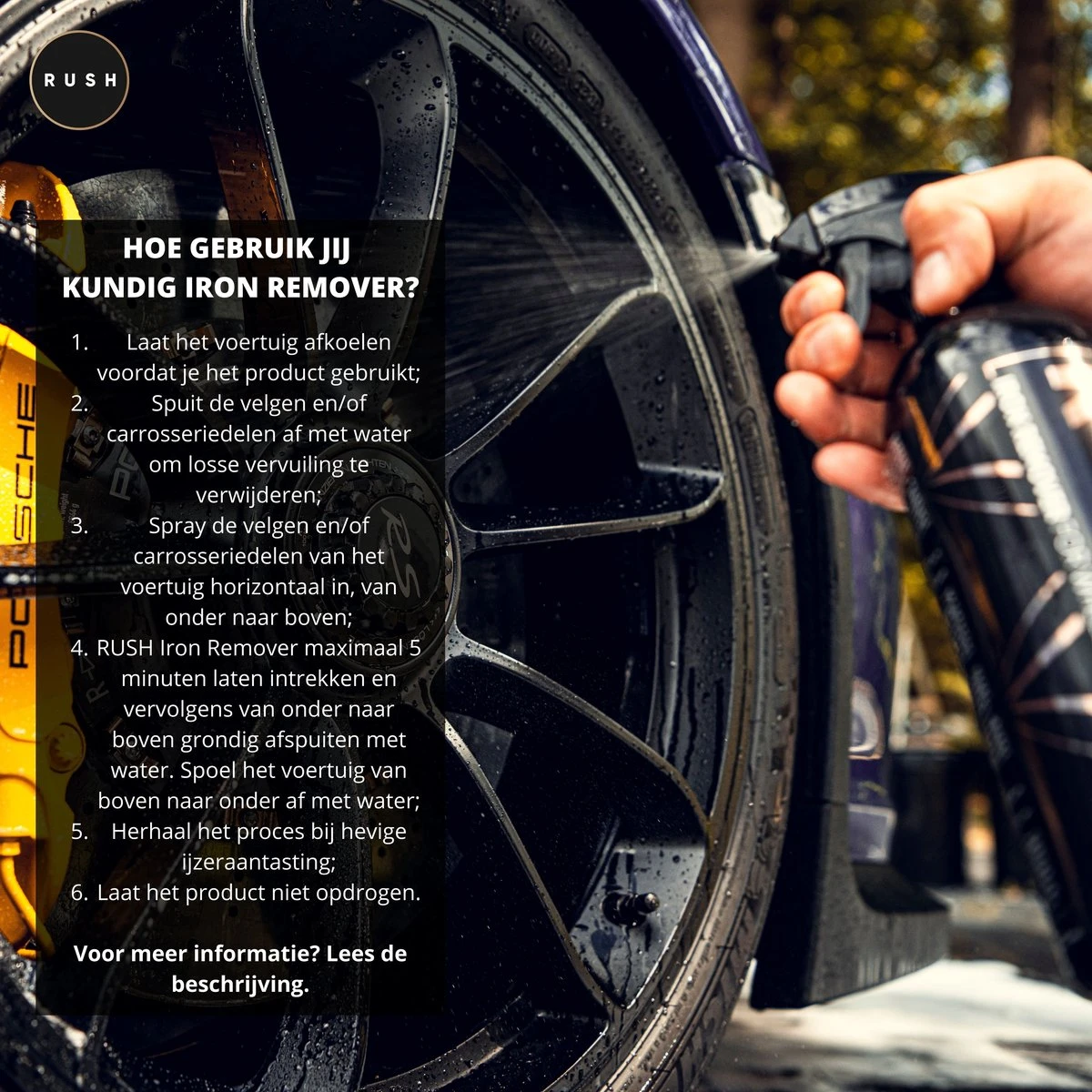 - RUSH Iron Remover maximaal 5 minuten laten intrekken en vervolgens van onder naar boven grondig afspuiten met water. Spoel het voertuig van boven naar onder af met water;