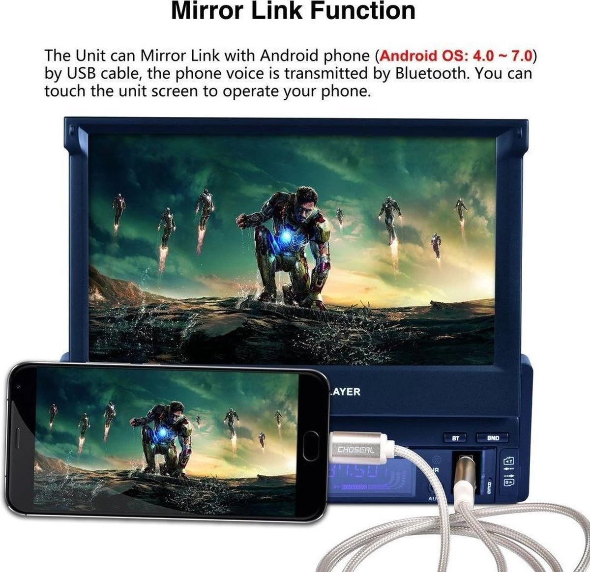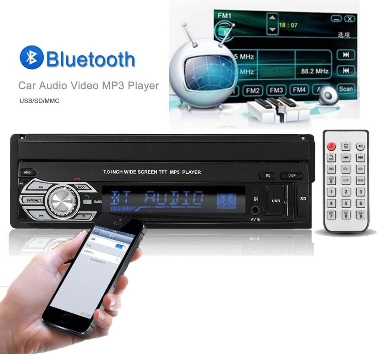 Het ultieme 1 Din 7 inch HD touchscreen uitklapscherm zorgt voor optimaal plezier van de radio in de auto. Speel uw favoriete nummers af via Bluetooth, MP3, AUX, SD of USB of luister naar de radio. Ook kunt u zelfs HD videos bekijken via de radio als uw telefoon is aangesloten.
