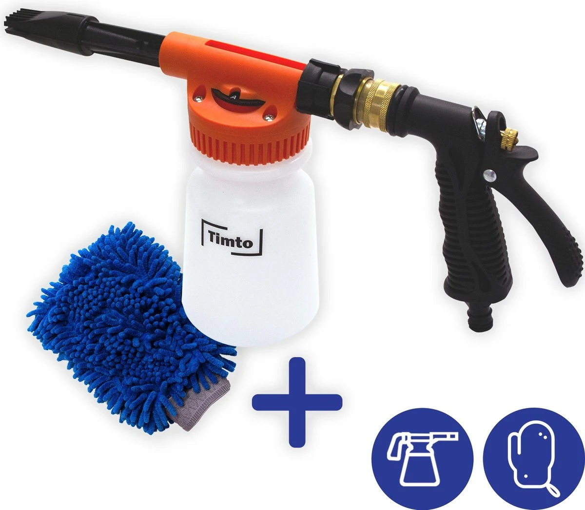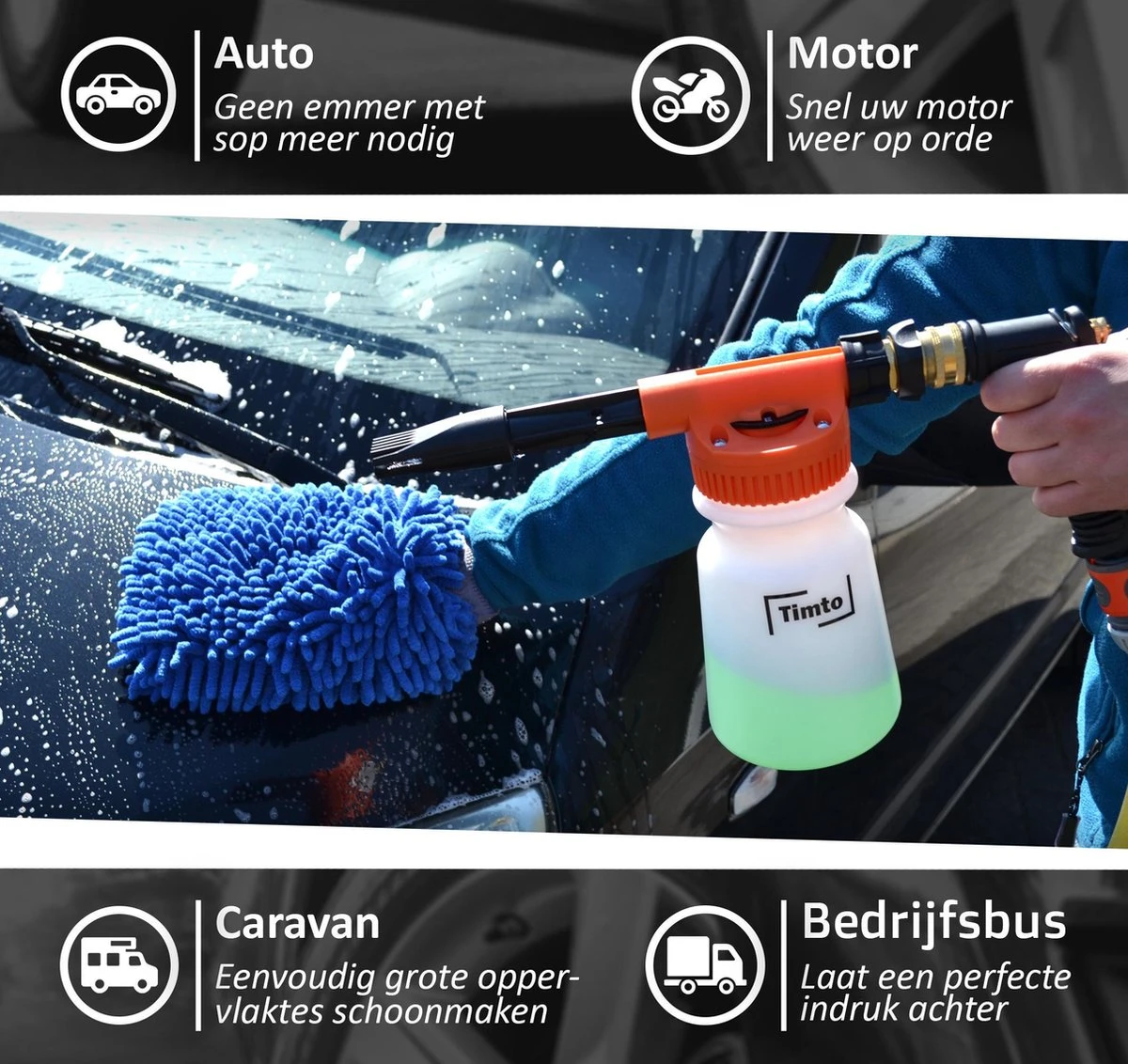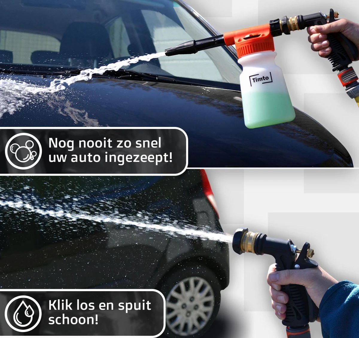 Eén emmertje sop en één emmertje om de spons schoon te wringen. Nadat u hiermee uw auto schoongemaakt had, was de volgende stap de tuinslang uitrollen en uw auto schoon te spuiten. Het Timto schuimapparaat combineert dit alles echter in één compact spuitpistool. Rol uw tuinslang uit, vul het spuitpistool met autoshampoo en u bent klaar om te poetsen! Breng een riante schuimlaag aan en gebruik de bijgeleverde washandschoen om het vuil van uw auto te verwijderen. Nadat u klaar bent met poetsen klikt u eenvoudig het zeep-gedeelte los van het apparaat en kunt u met het overgebleven waterpistool de schuim afspoelen. Super makkelijk dus!