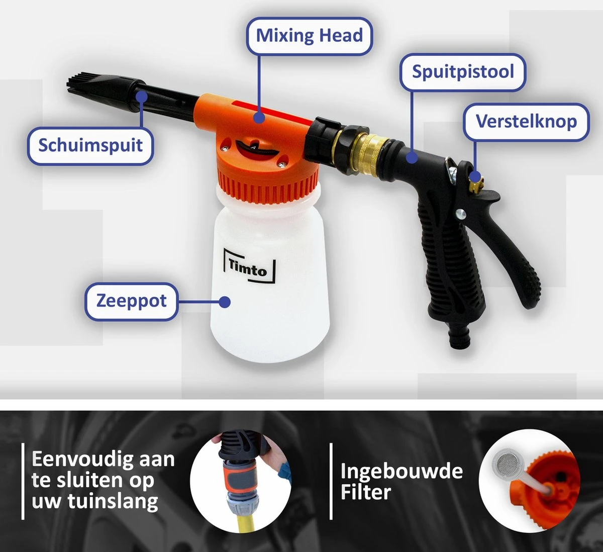 Hogedrukspuiten en het schoonmaken van uw auto, een veelbesproken combinatie. Wij van Timto hebben het beste voor met uw voertuig en raden daarom het gebruik van een hogedrukreiniger af. Zo kan de hoge druk van het water uw lak of rubberen afdichtingen beschadigen. Dit kunt u gelukkig eenvoudig voorkomen door het Timto Schuimapparaat te gebruiken. Aansluitbaar op iedere tuinslang met een Gardena aansluiting. U zult de hogedrukreiniger niet missen!