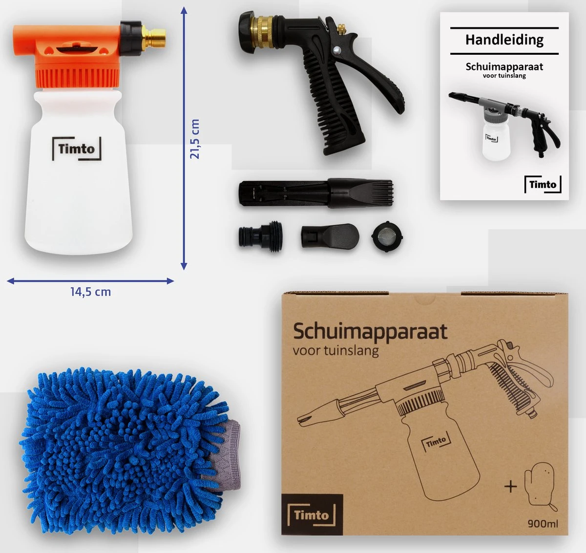 ✔ Inhoud: 1x Timto Schuimapparaat, 1x Washandschoen, 1x Handleiding