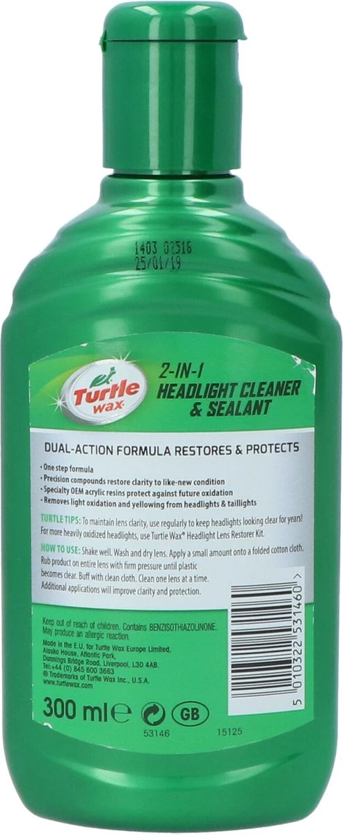 De Turtle Wax Headlight Cleaner & Sealant wordt aanbevolen voor het verwijderen en herstellen van oxidatie op helder plastic koplampen en achterlichten. Voor het verwijderen van krassen van helder plexiglas, kunststof ramen of andere licht doorlatende kunststoffen.