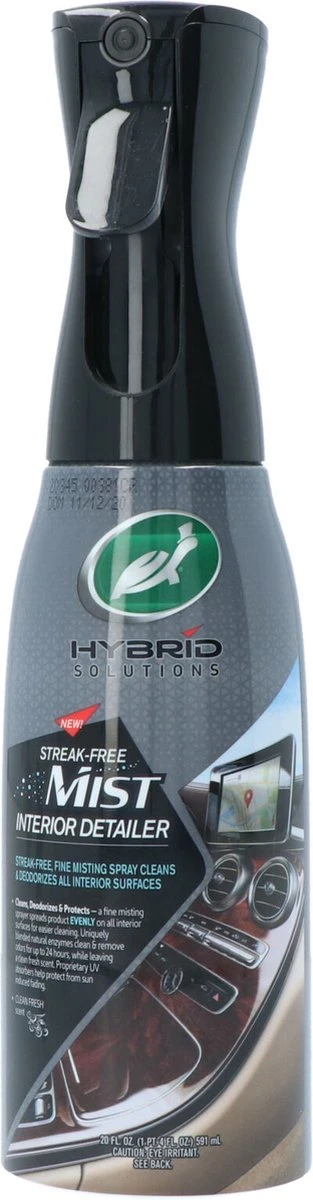 Turtle Wax Hybrid Solutions Streak-Free Mist Interior Detailer is anders dan alle andere. Het uniek ontworpen doseersysteem biedt hoge prestaties zonder de gevaren van traditionele spuitbussen. Het reinigt, neutraliseert geuren en beschermt en de fijne vernevelaar verdeelt het product gelijkmatig over alle oppervlakken van het interieur voor een gemakkelijkere reiniging.