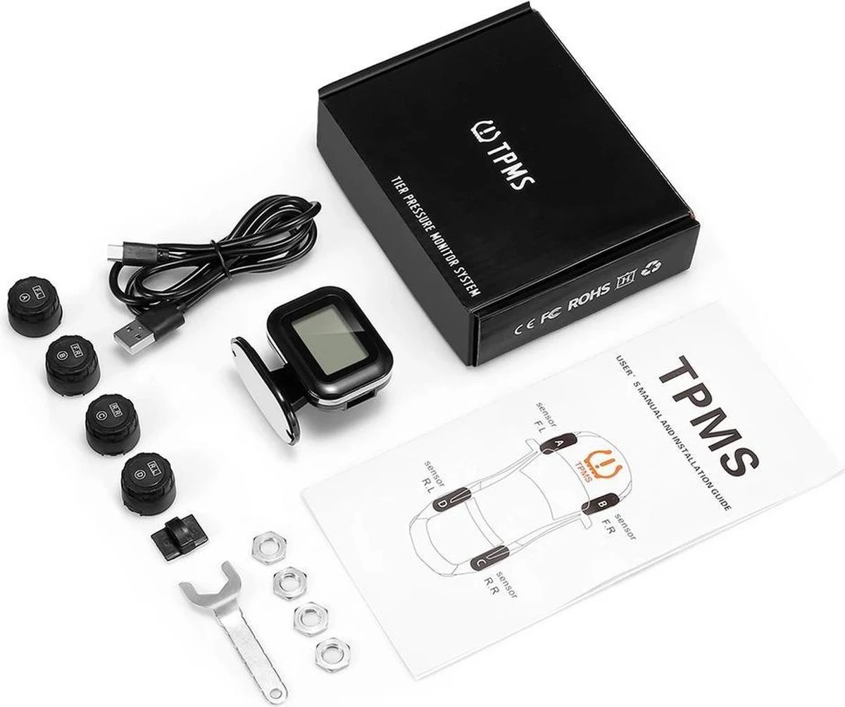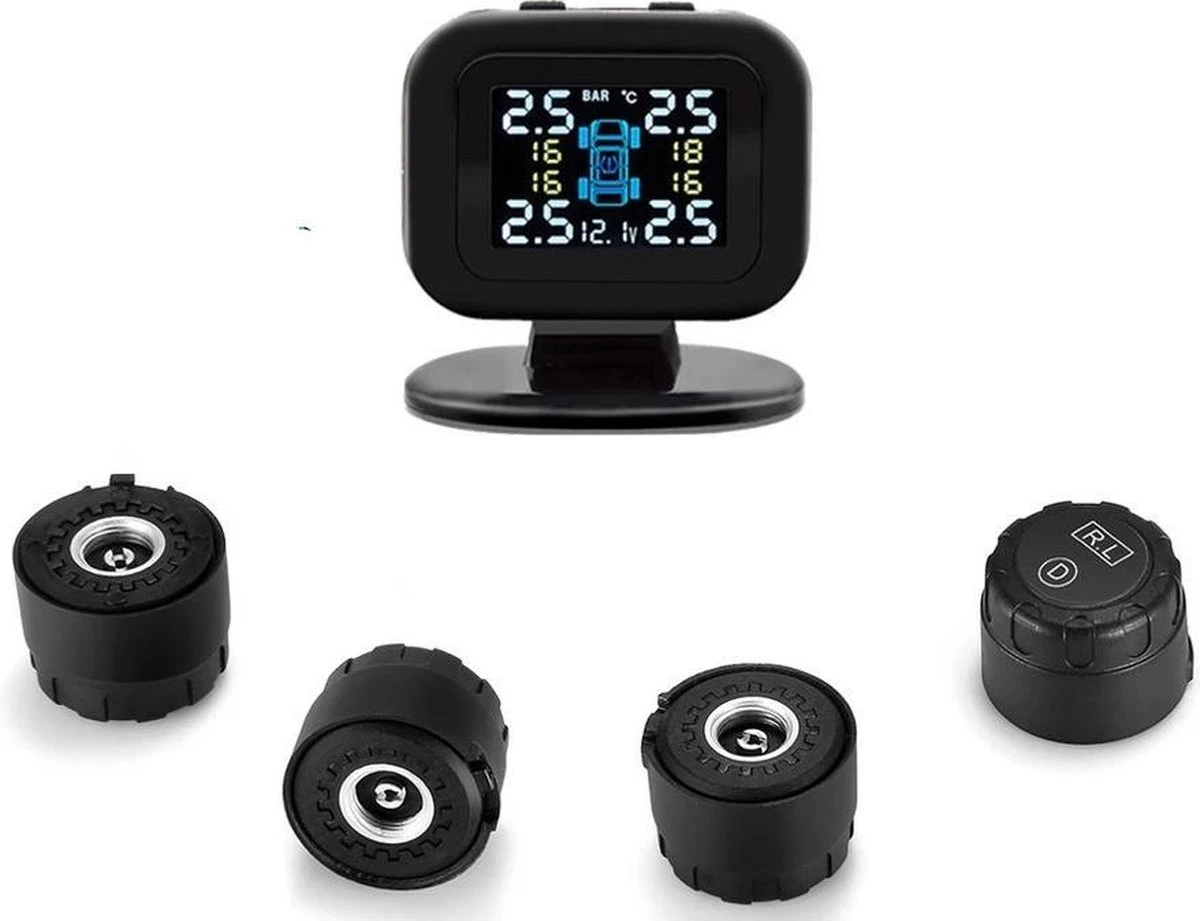 Het real time Twente Shopping bandenspanningscontrolesysteem (TPMS) geeft je continu inzicht in de bandenspanning van je voor- en achterbanden. De 4 ventieldoppen dienen als sensor. Het scherm wordt op het dashboard bevestigd. Dit wordt door de bijgeleverde USB-kabel van stroom voorzien.
