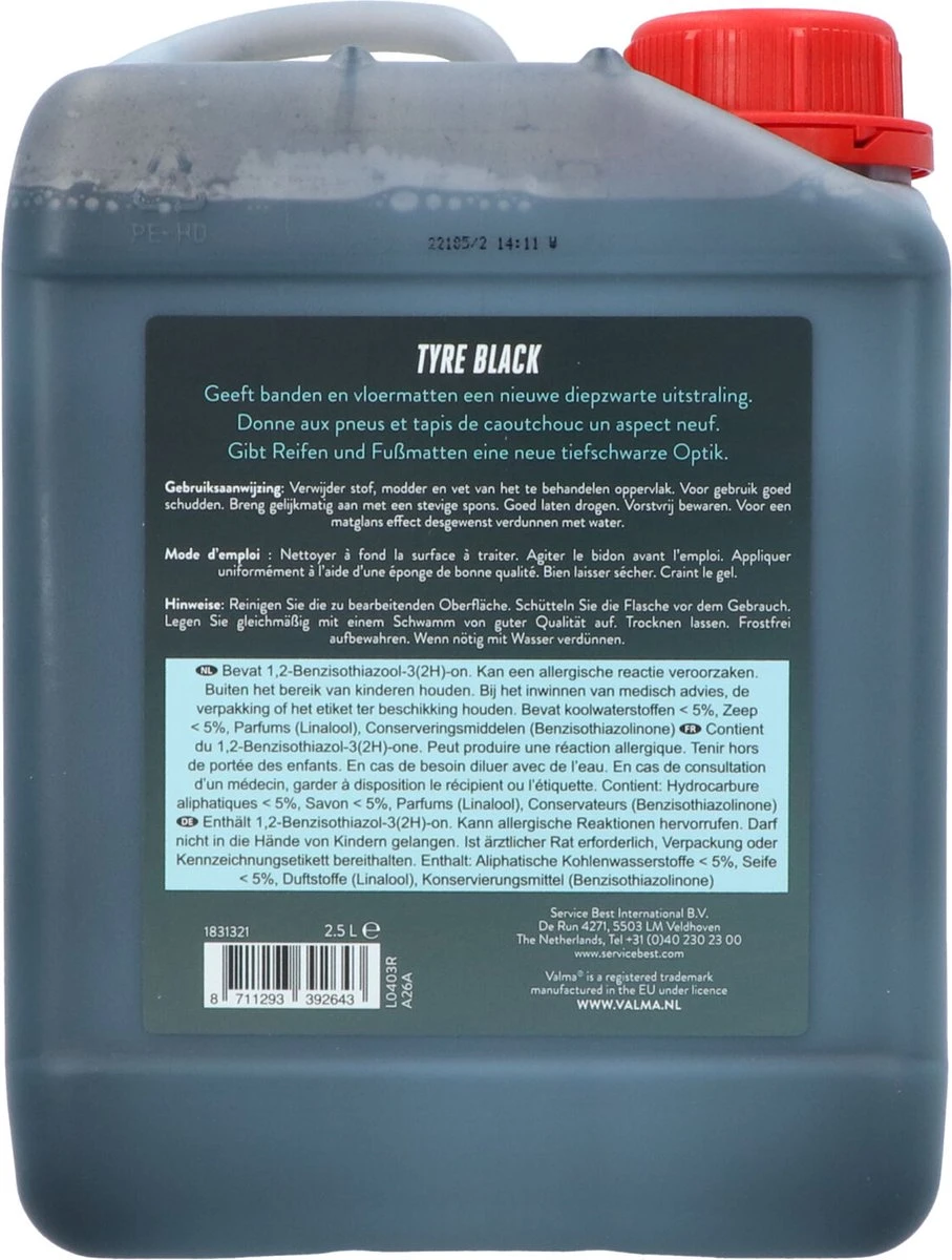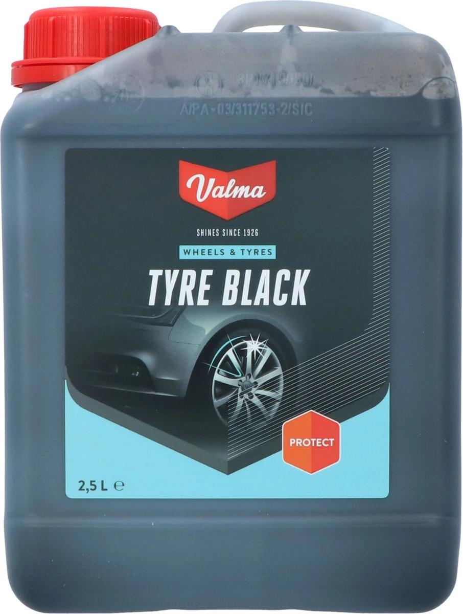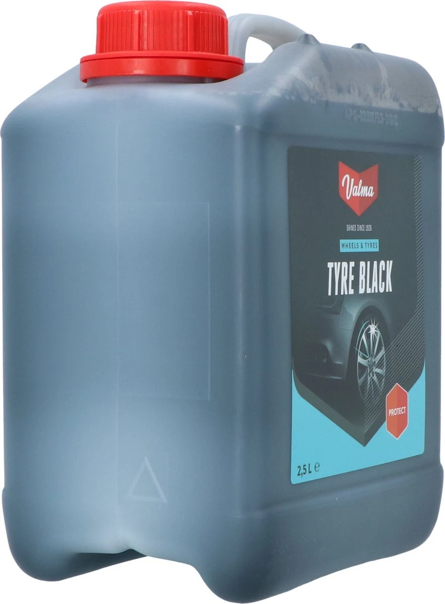 Valma Tyre Black laat de autobanden of rubberen vloermatten er weer als nieuw uitzien. Banden zwart is vrij van oplosmiddelen en zorgt voor een diepzwarte langdurige glans en laat de banden en rubberen matten er weer showroom zwart uitzien.
