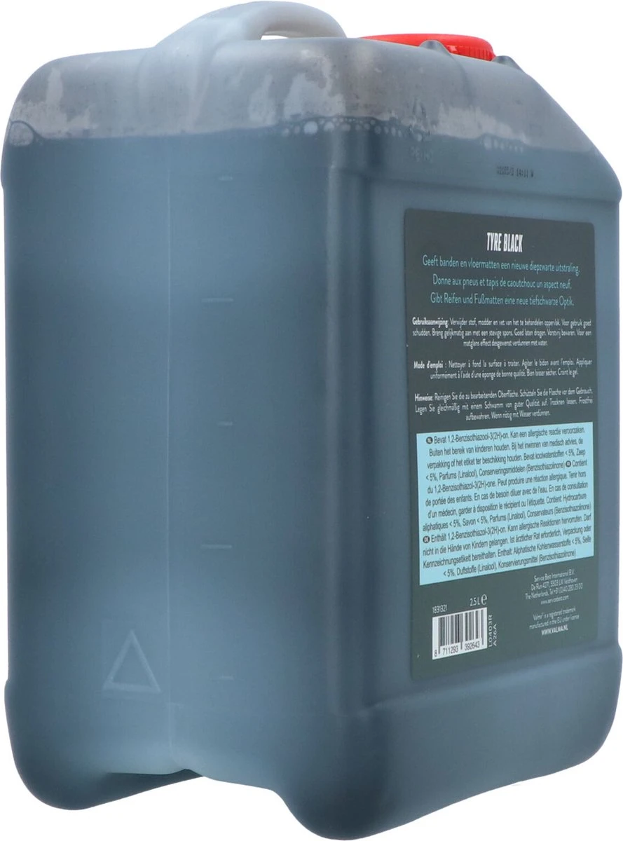 Zorg ervoor dat de autobanden droog zijn en verwijder overmatig stof, vuil, modder en vet van de band voor het aanbrengen van de Valma banden zwart. Voor een matglans effect verdun de Tyre Black met water. Banden zwart is het product dat de poetsbeurt afmaakt. Inhoud 2,5 liter.