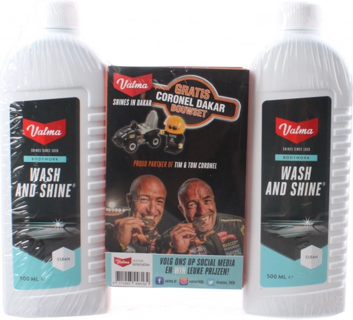 De Valma Wash & Shine set reinigt grondig, snel en veilig alle vuil, vet en aanslag van de autolak zonder strepen. De Valma Wash & Shine shampoo breekt de bestaande wax laag niet af. Door de unieke samenstelling is de Valma Shampoo geschikt voor alle soorten lakken. Wash & Shine herstelt de glans en laat een beschermende waslaag achter. De set bestaat uit 2 flessen shampoo à 500 ml en een spons.
