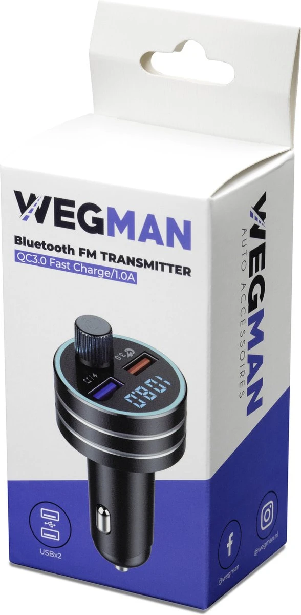Muziek streamen, Handsfree bellen en navigeren kan allemaal met deze Bluetooth Auto FM Transmitter van Wegman. Dankzij de FM transmitter kan je gemakkelijk jouw smartphone verbinden met de autoradio door middel van een vrije FM frequentie. De transmitter is voorzien van een QC3.0 Fast Charge USB-poort om uw telefoon super snel op te laden en een Carkit functie om altijd bereikbaar te zijn. Sluit de transmitter eenvoudig aan via de 12V of 24V poort (sigarettenaansteker) van de auto. FM Transmitter Carkit